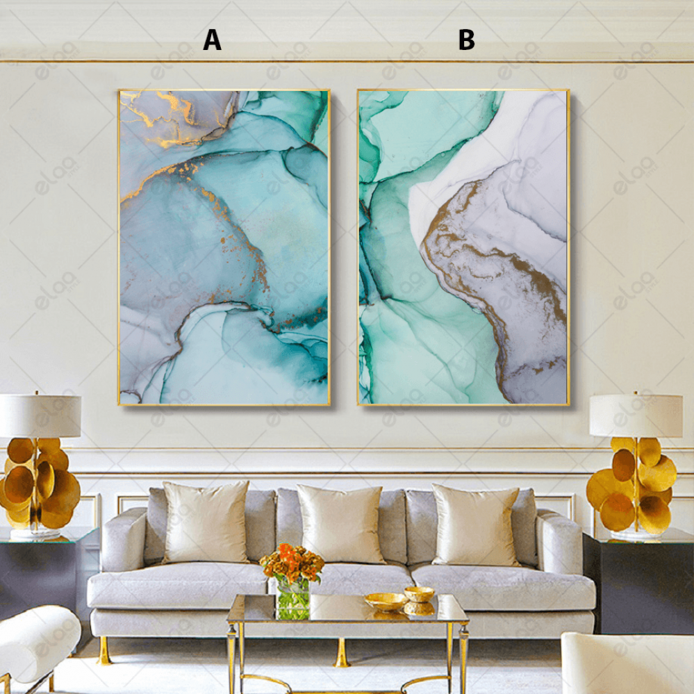 Tableaux d'art abstrait, nuances de gris et turquoise mélangées à de l'eau dorée - E2P0024