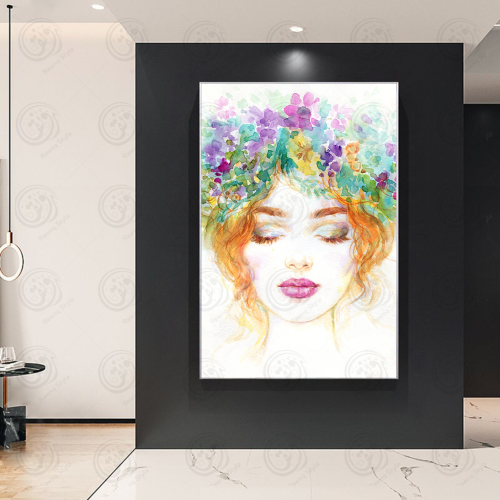 ქალის ნახატი თავის თავზე ყვავილებით აკვარელში - E1PR-13471
