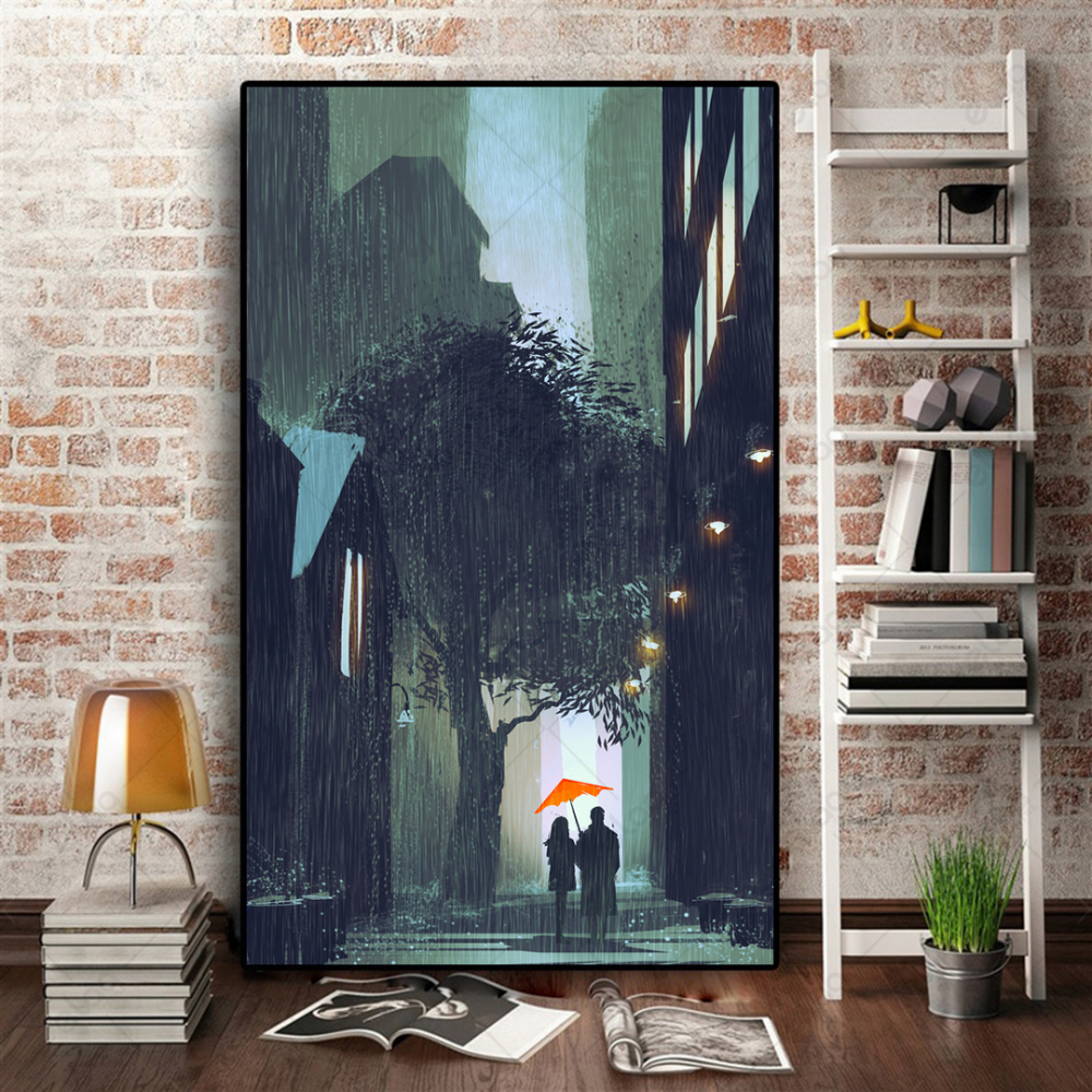 წყვილის ხატვა წითელი ქოლგებით ღამით წვიმიან ქუჩაზე სეირნობისას - E1P3141