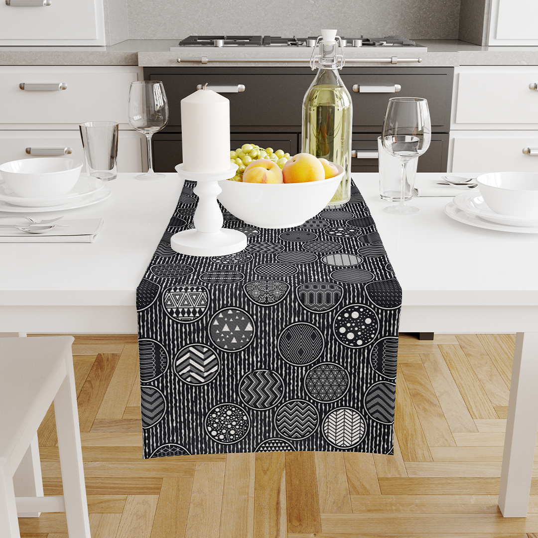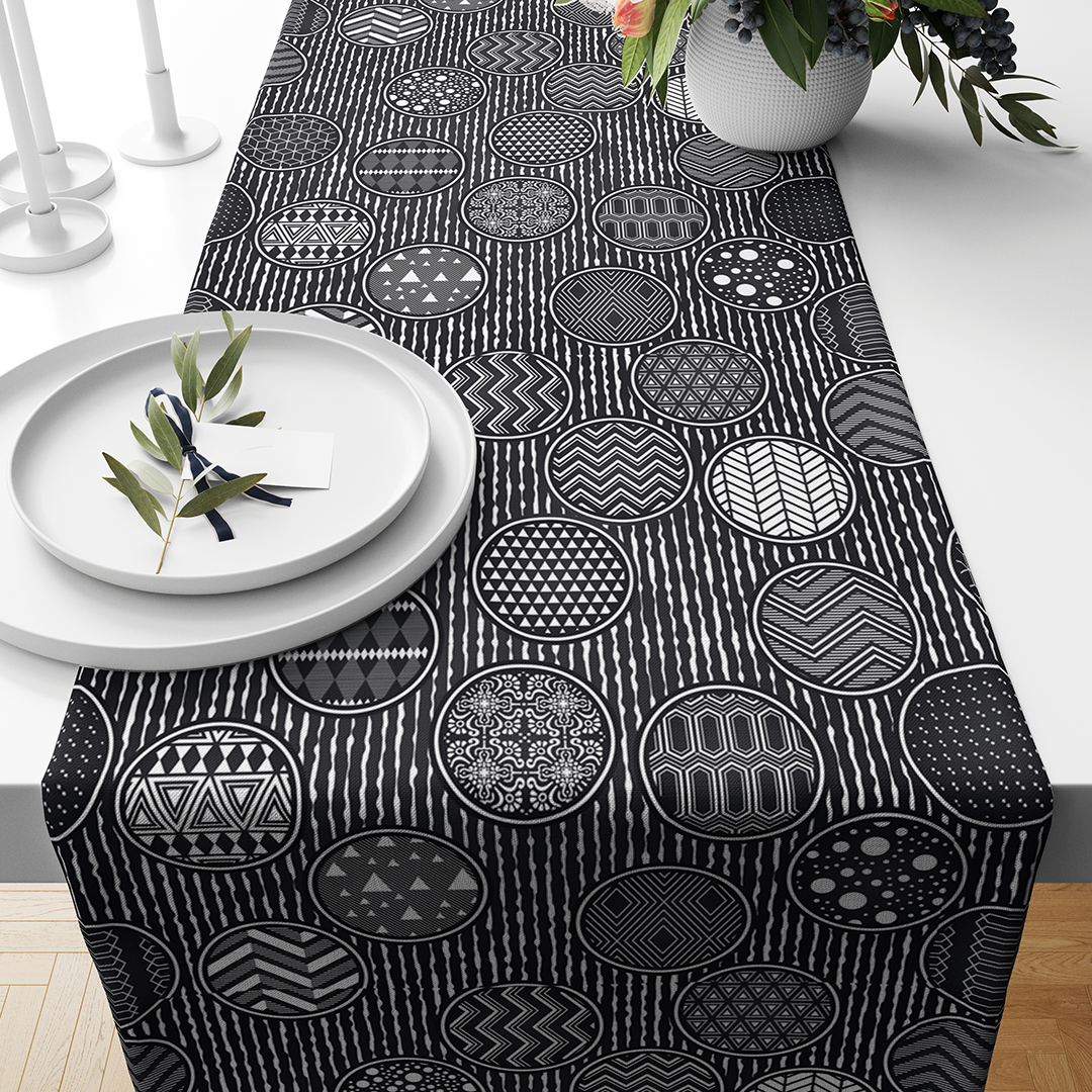 მაგიდის მორბენალი - ეთნიკური ყვავილოვანი უნაკერო ნიმუში მანდალას შავი ფონით -m10045