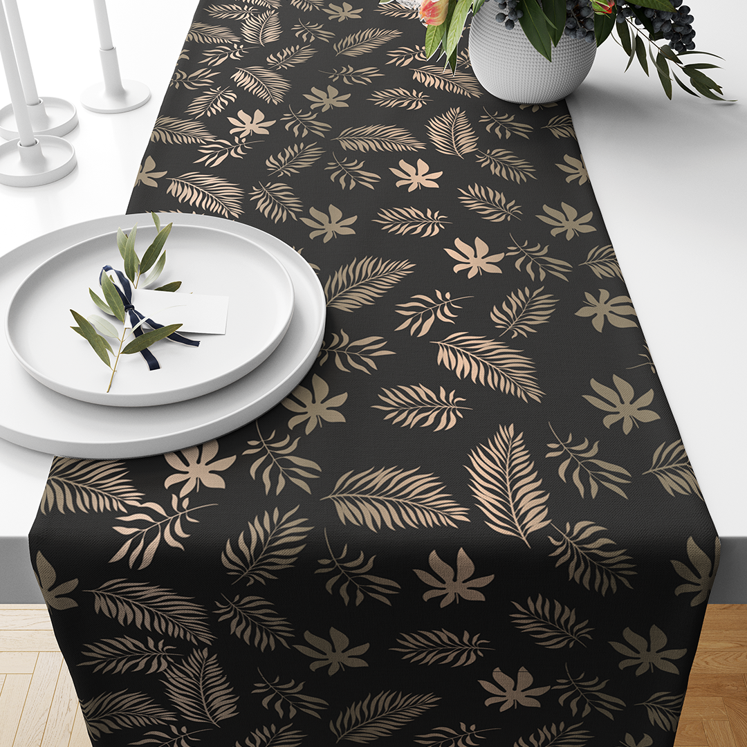მაგიდის მორბენალი - მდიდრული ტროპიკული ნიმუში. ოქრო მუქ ფონზე -m10044