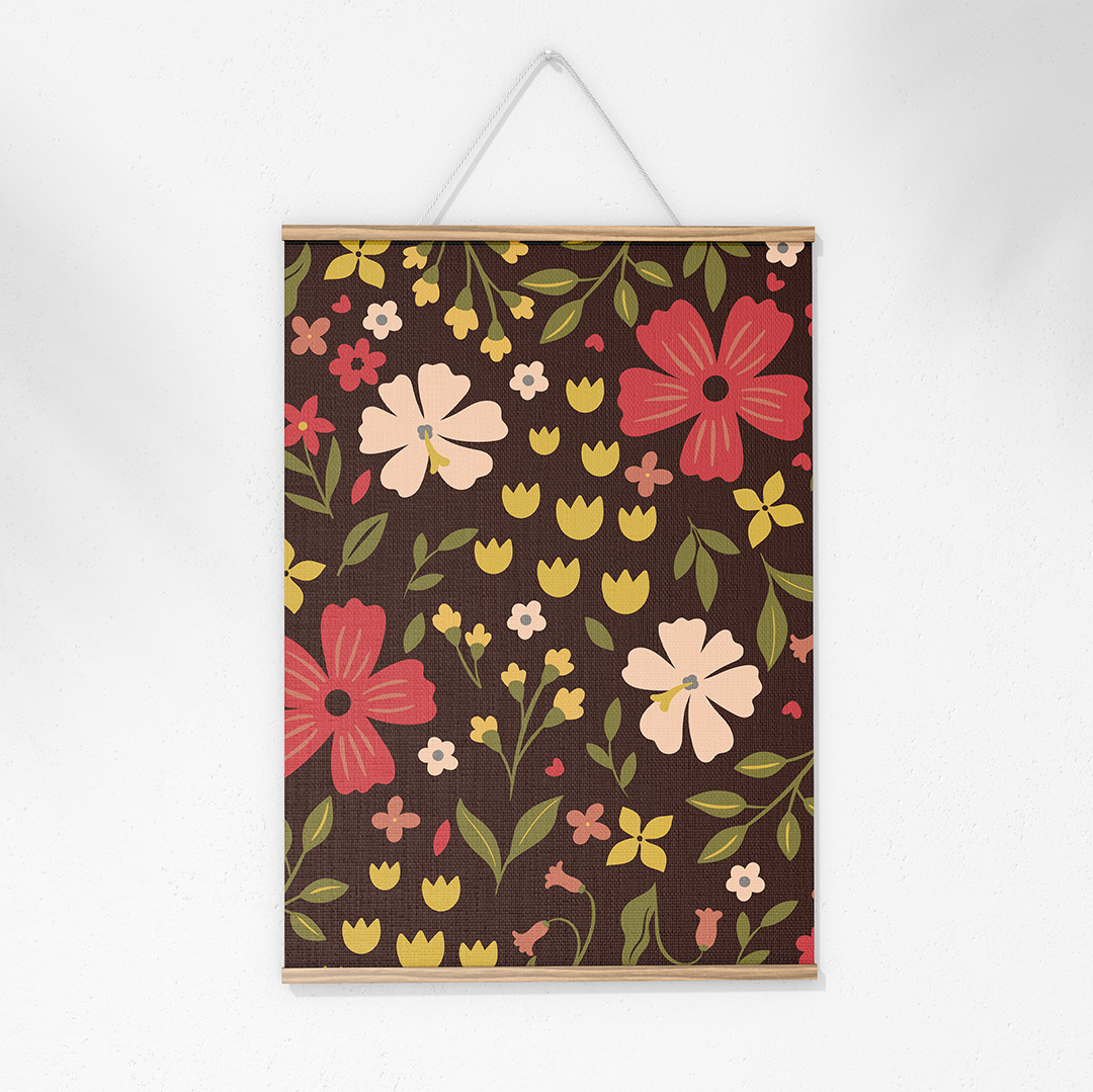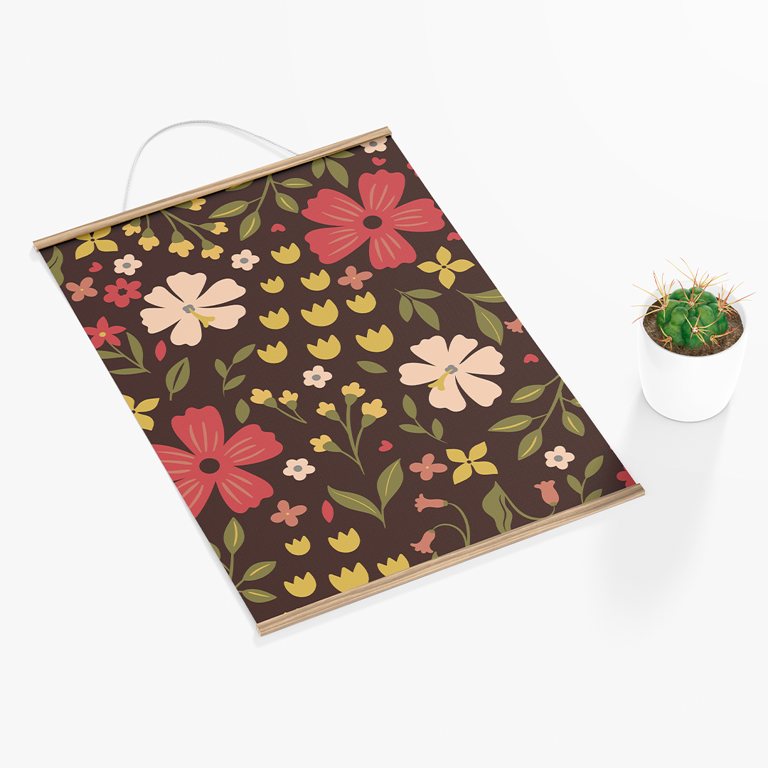 კედელზე ჩამოსაკიდი - მარტივი უნაკერო ნიმუში ყვავილებით მუქ ყავისფერ ფონზე - M10114
