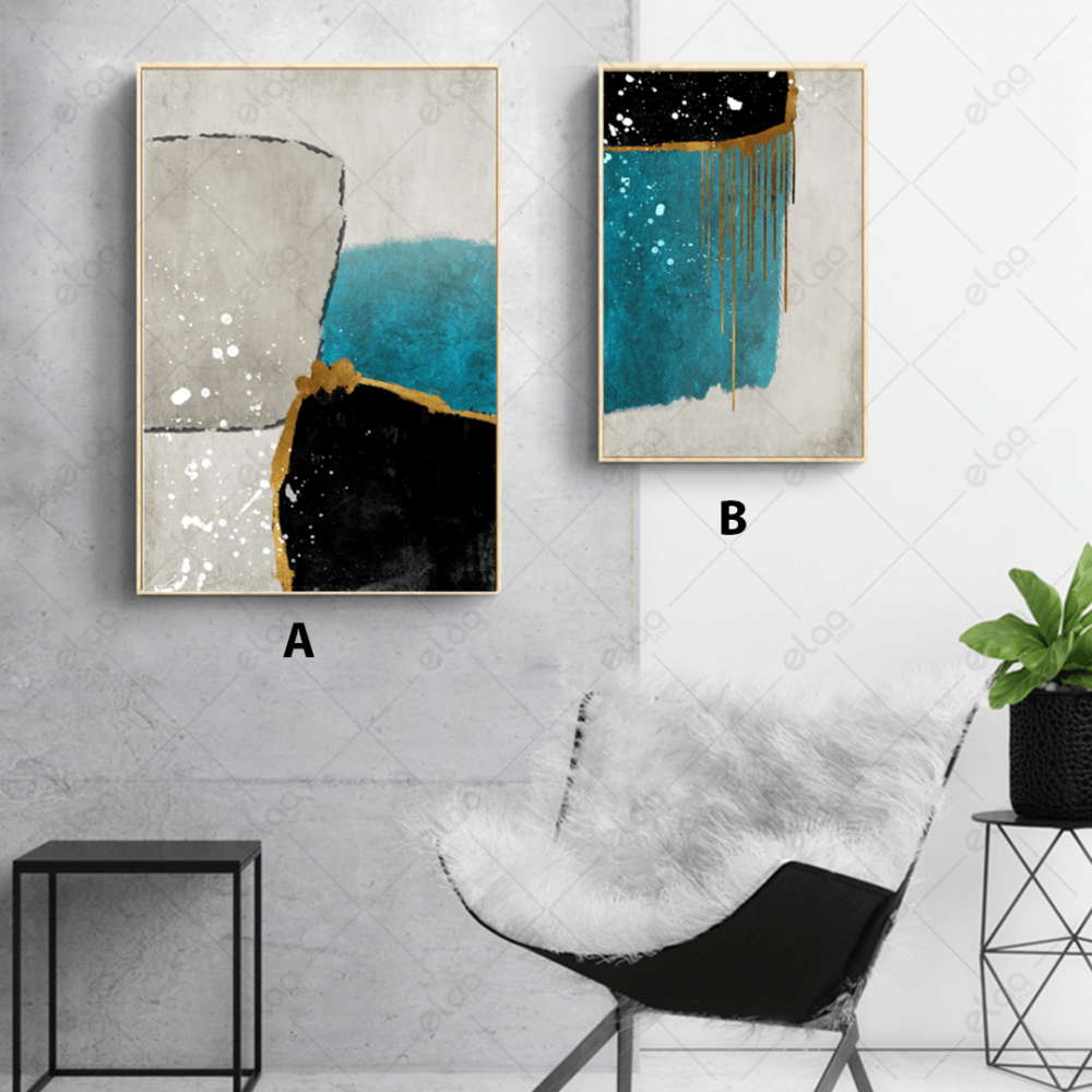 Abstract art painting with a mixture of gold, turquoise and black colors on a silver background - E2P0099