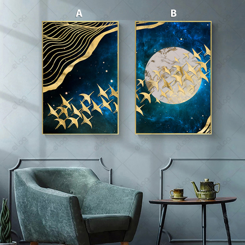Abstract art paintings of migratory birds and a group of butterflies in gold with a dark blue background - E2P0020