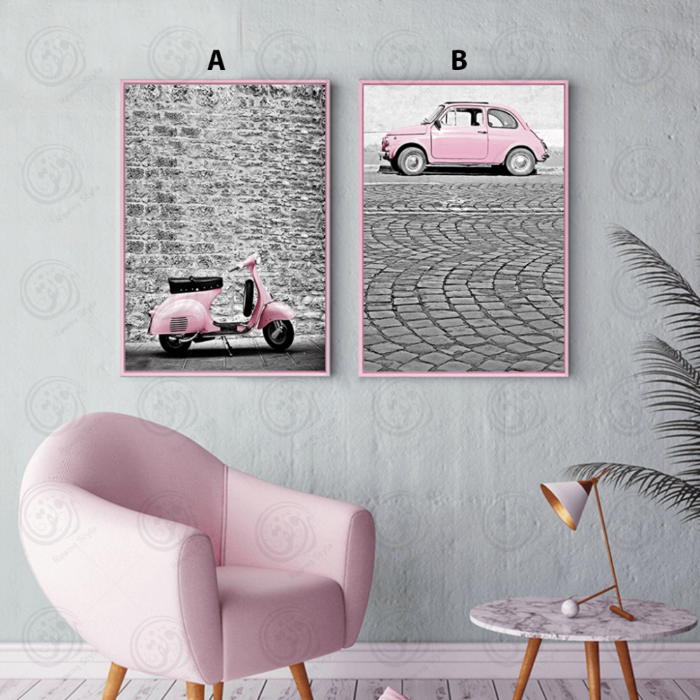 A mural of a bicycle and a car on the road in pink color - E2PR-20103