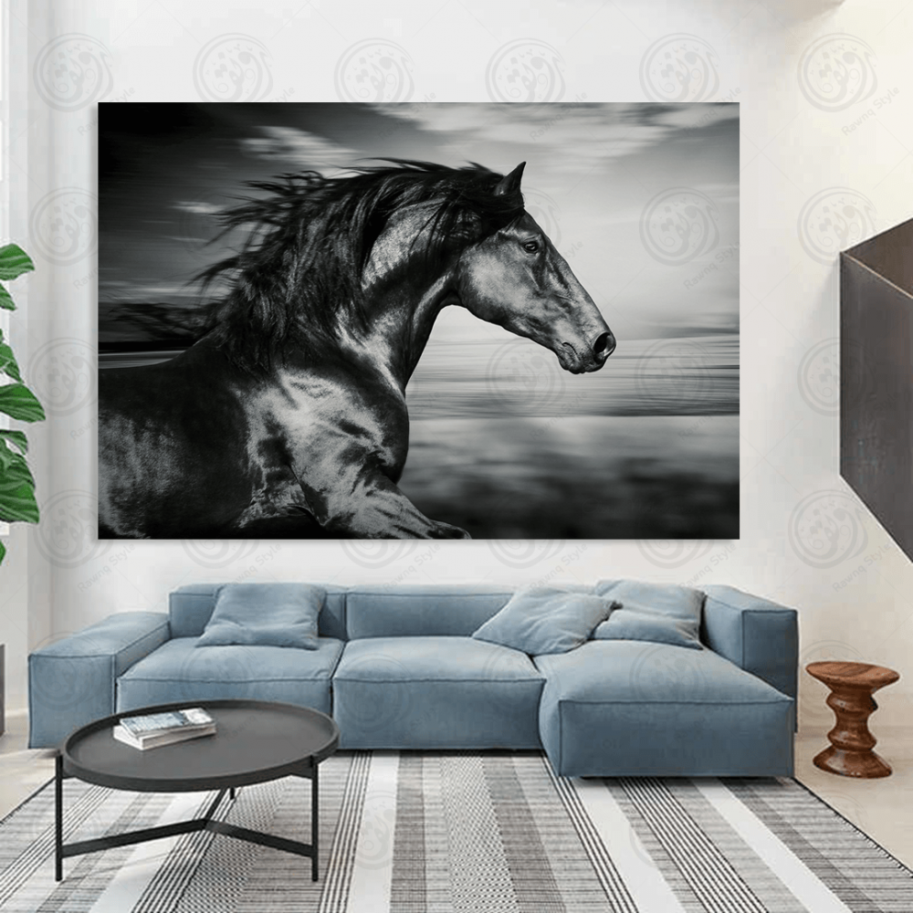 A painting of a horse running in black and white - E1PR-10406