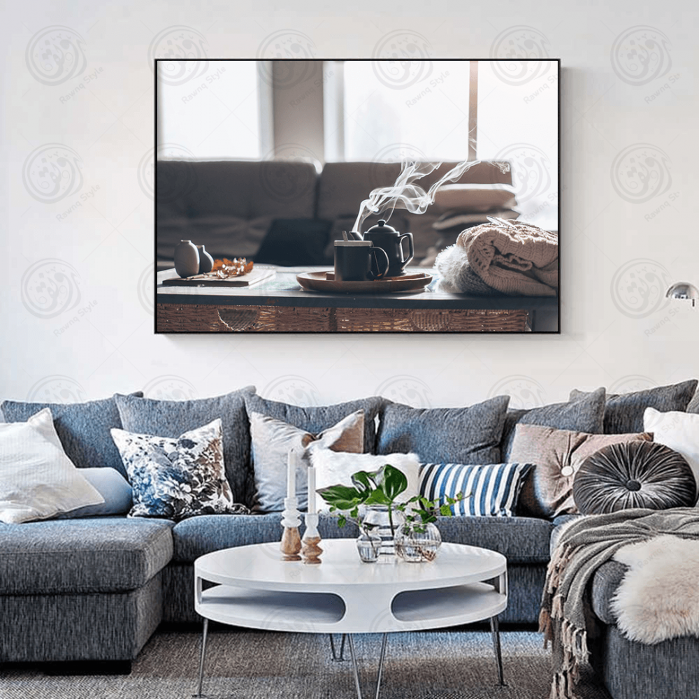 A painting of a steaming tea cup on a tray on a table - E1PR-11527