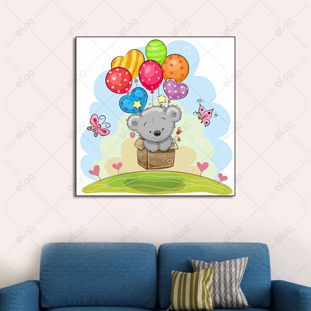 A painting of a teddy bear in the box flying on balloons - E1P1861