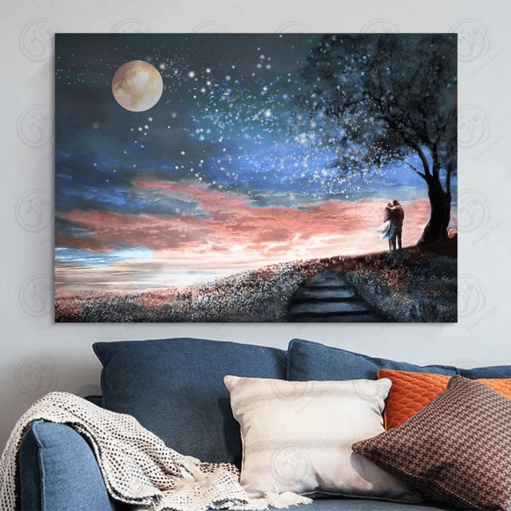 A painting of sky, stars, moon, woman and man under a tree - E1PR-10251