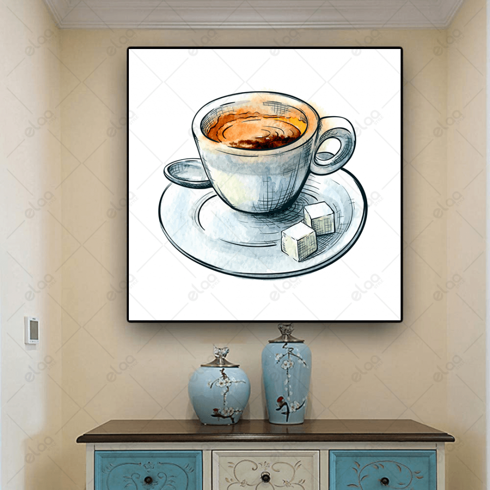 A wall painting of a coffee cup with sugar pieces on a plate - E1P0444