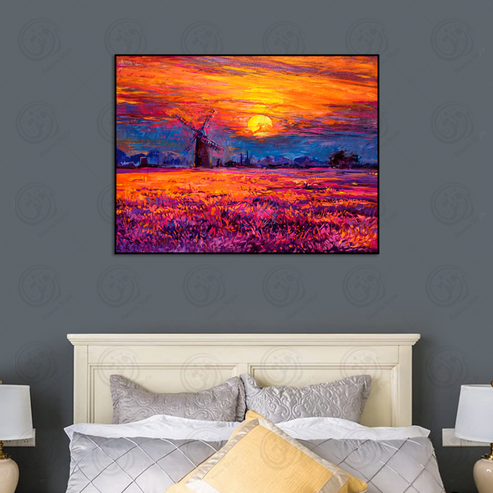 Colorful sunset painting, windmill and flower field - E1PR-13201
