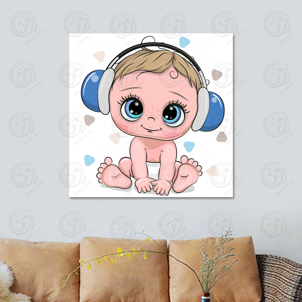 Painting of a child with blue headphones on a white background - E1PR-14437
