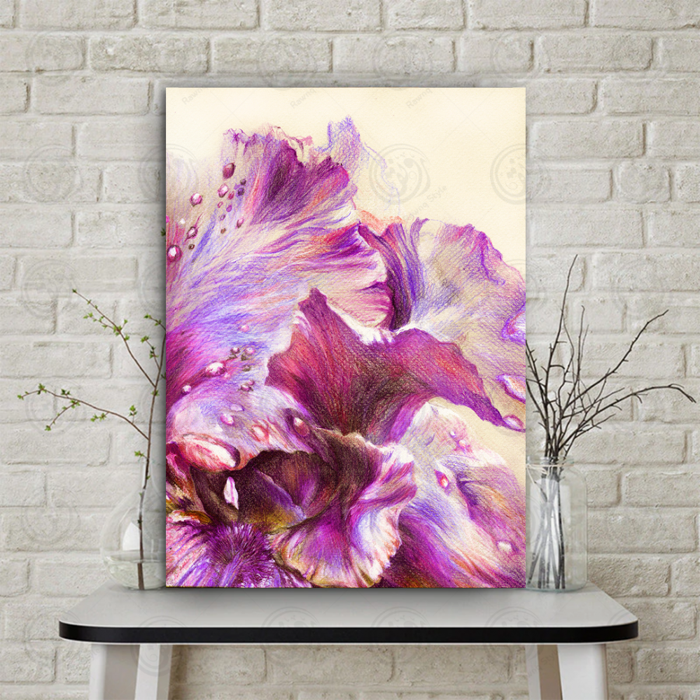 Canvas prints do not include a stretcher bar or picture frame. It will arrive rolled up in tube packaging. Poly-cotton blend with a perfect gloss finish. Genuine artist-quality material that is scratch, crack, and warp-resistant. Printed with UL Certified ink. Water-resistant, anti-fade, and anti-yellowing. The size of the print is measured in inches. The conversion to centimeters is rounded down.