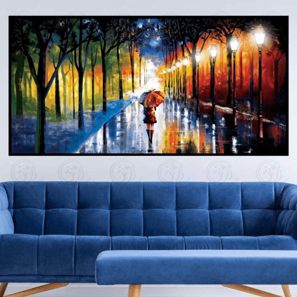 Peinture d'une femme marchant dans une rue pluvieuse - E1PR-11094