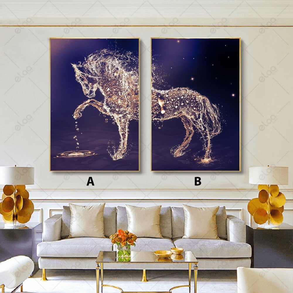 Tableaux de chevaux avec de l'eau sur fond bleu foncé - E2P0155
