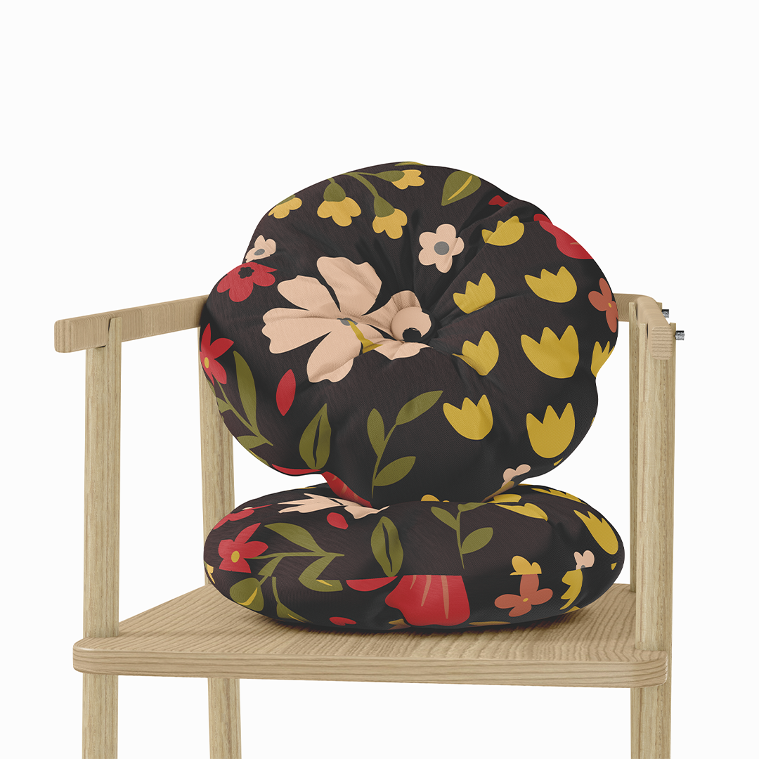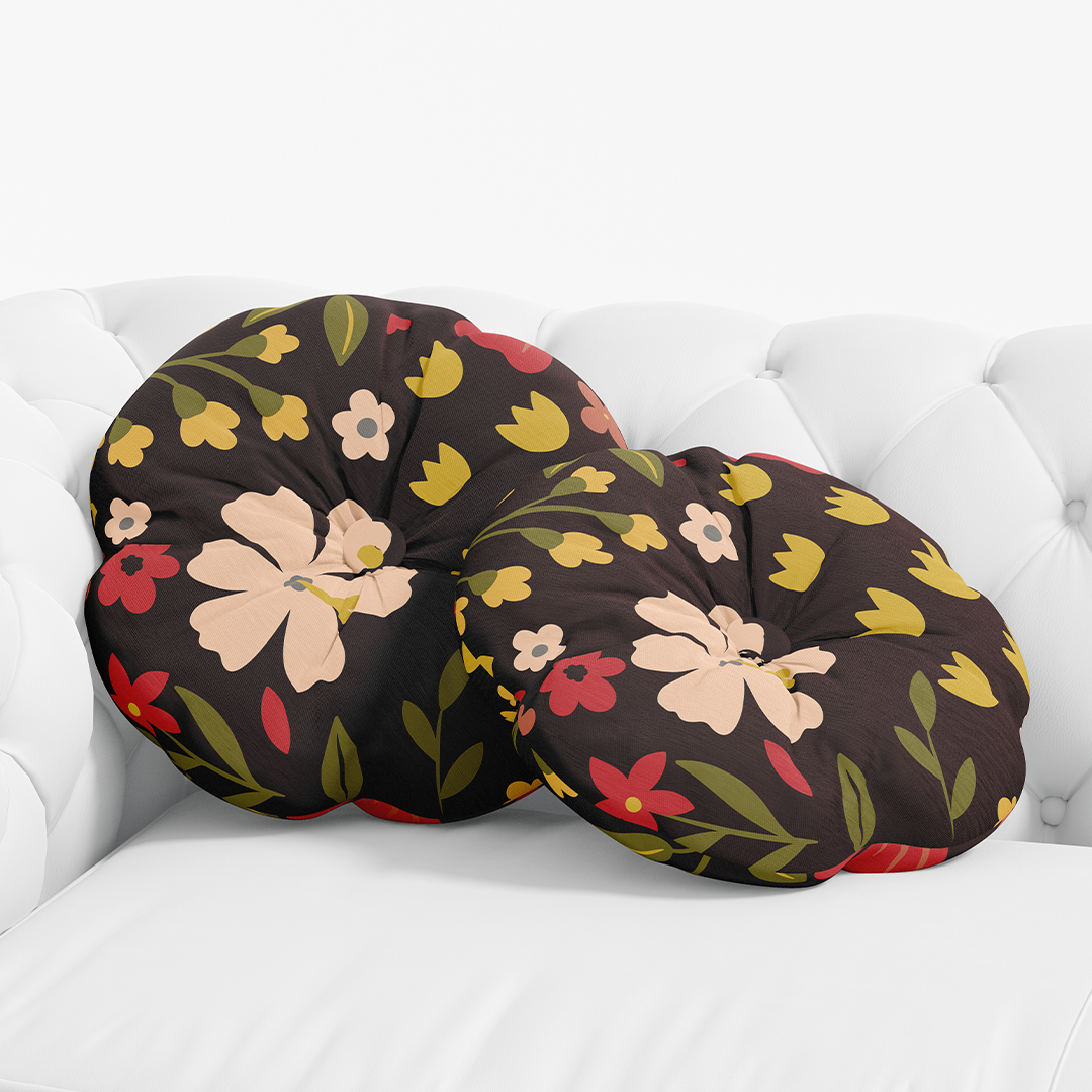 მრგვალი სასროლი ბალიში - მარტივი უნაკერო ნიმუში ყვავილებით მუქ ყავისფერ ფონზე - M10114