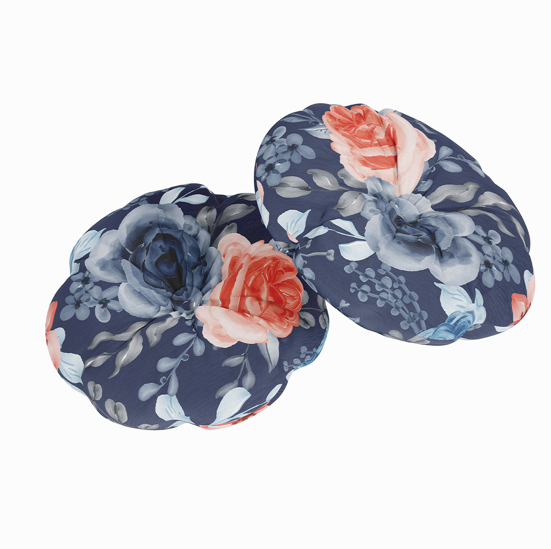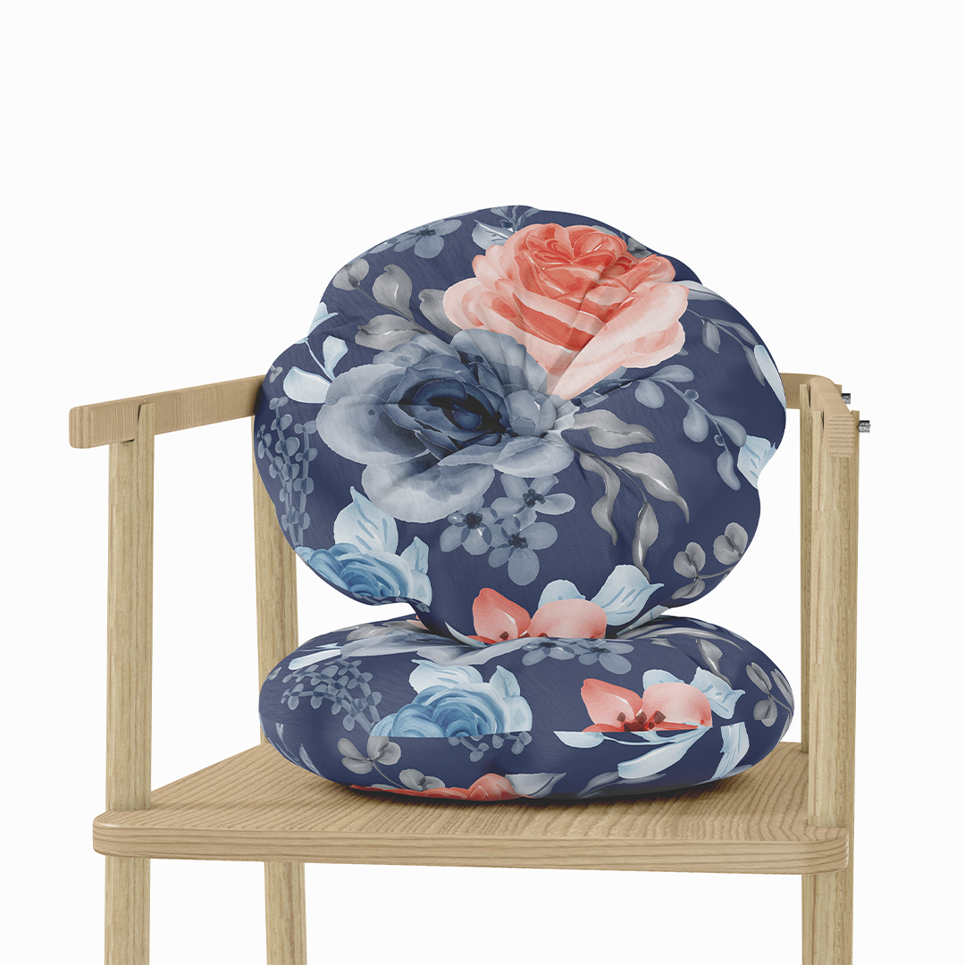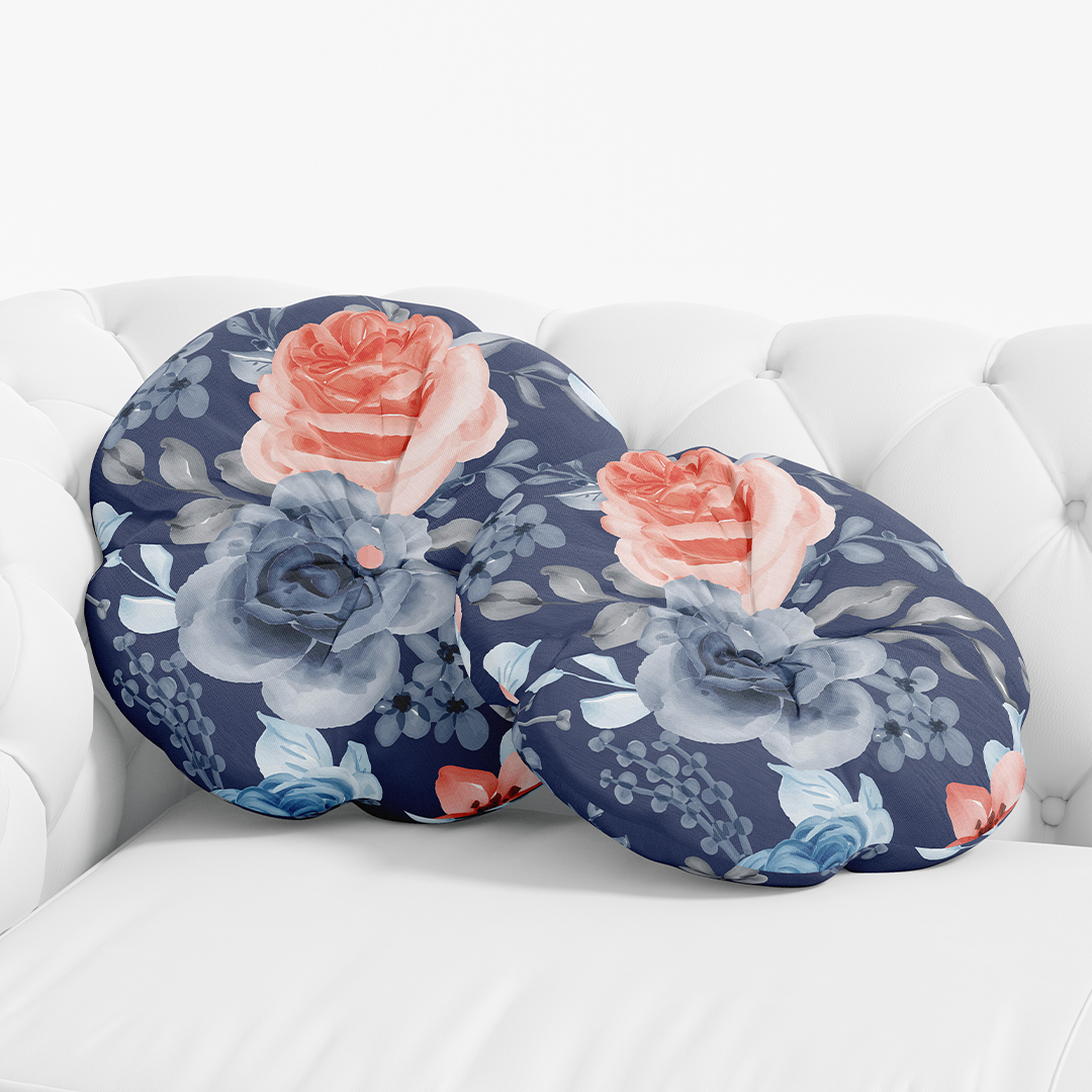 მრგვალი სასროლი ბალიში - აკვარელის ყვავილი ვარდი ნარინჯისფერი ლურჯი და ფოთლების უწყვეტი ნიმუში -m10075