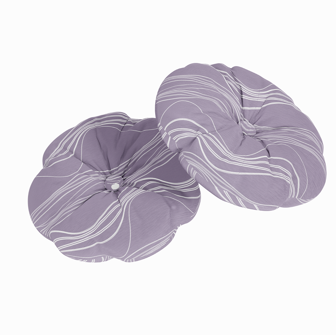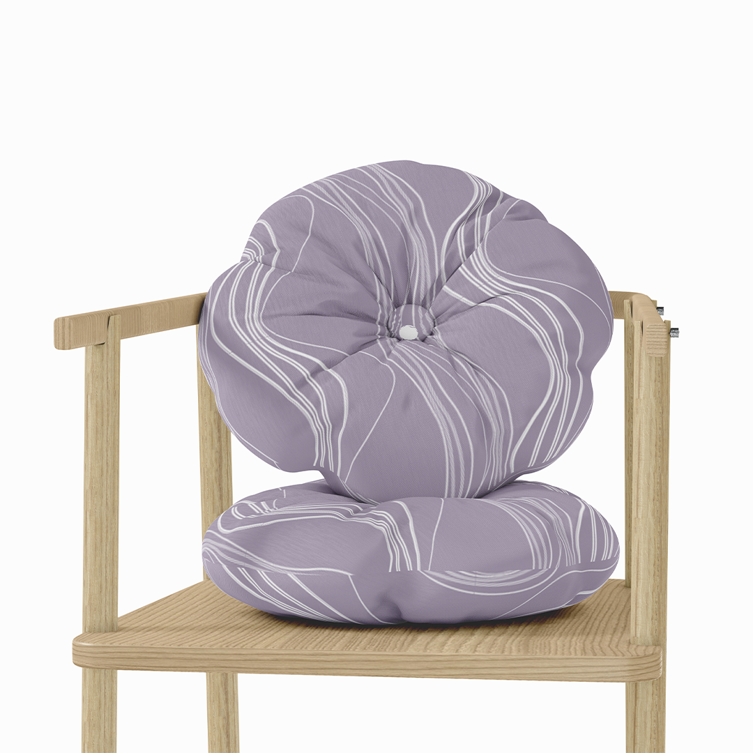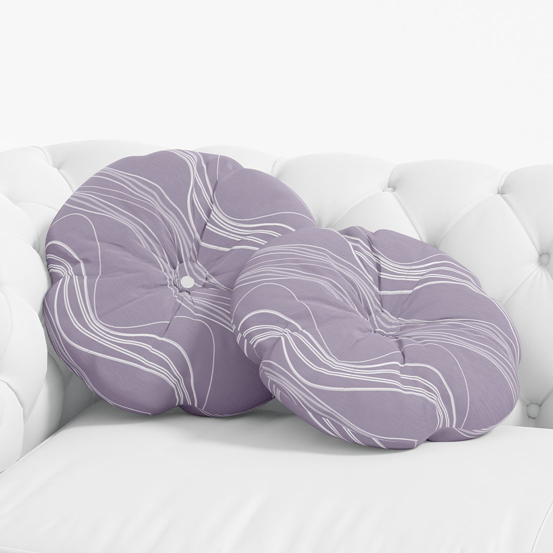 მრგვალი სასროლი ბალიში - თეთრი მრუდი ხაზები აბსტრაქტული ნიმუშით, მეწამული უწყვეტი ვექტორული ფონით. -m10027
