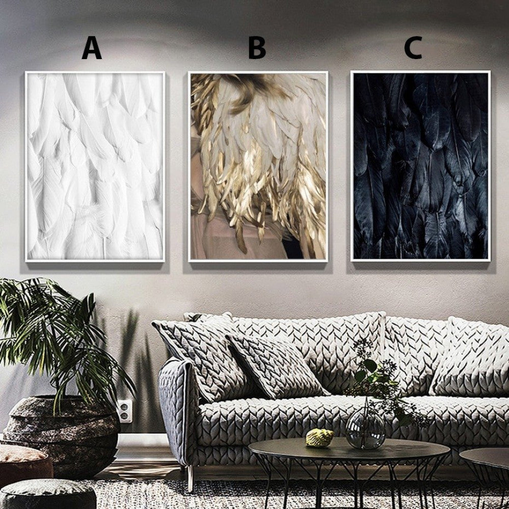 Paintings golden, black and white feathers - E3PR-30511