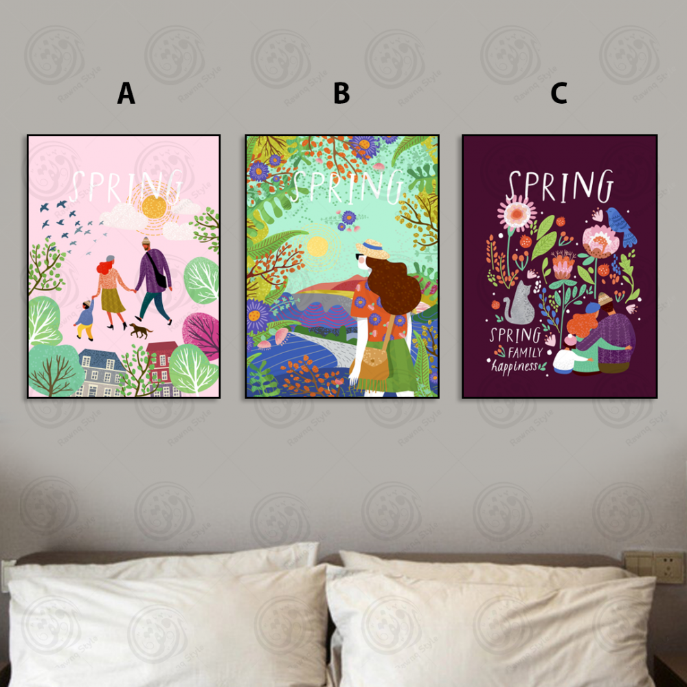 Spring Posters Paintings Family and Cat Surrounded by Floral Patterns - E3PR-30678